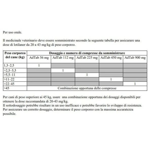 Per uso orale. Il medicinale veterinario deve essere somministrato secondo il seguente elenco per assicurare una dose di lotilaner da 20 a 43 mg/kg di peso corporeo. Peso corporeo del cane: 1,3-2,5 kg. Dosaggio e numero di compresse da somministrare. AdTab 56 mg: 1. Peso corporeo del cane: >2,5- 5,5 kg. Dosaggio e numero di compresse da somministrare. AdTab 112 mg: 1. Peso corporeo del cane: >5,5-11,0 kg. Dosaggio e numero di compresse da somministrare. AdTab 225 mg: 1. Peso corporeo del cane: >11,0-22,0 kg. Dosaggio e numero di compresse da somministrare. AdTab 450 mg: 1. Peso corporeo del cane: >22,0-45,0 kg. Dosaggio e numero di compresse da somministrare. AdTab 900 mg: 1. Peso corporeo del cane: >45 kg. Dosaggio e numero di compresse da somministrare: combinazione opportuna delle compresse. Per cani di peso superiore ai 45 kg, usare una combinazione opportuna dei dosaggi disponibili per ottenere la dose raccomandata di 20-43 mg/kg. Il sottodosaggio puo' causare inefficacia e favorire lo sviluppo di resistenza. Per assicurare un corretto dosaggio, determinare il peso corporeo con la massima accuratezza possibile. AdTab e' una compressa masticabile aromatizzata appetibile. Somministrare la compressa masticabile con il cibo o dopo i pasti. Per un controllo ottimale dell'infestazione da pulci e zecche, il prodotto deve essere somministrato a intervalli mensili durante la stagione delle pulci e/o zecche, in base alle situazioni epidemiologiche locali.