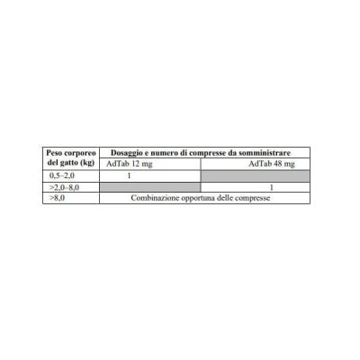 Sostanza attiva: compressa masticabile. AdTab compresse masticabili per gatti (0,5-2,0 kg). Lotilaner: 12 mg. AdTab compresse masticabili per gatti (>2,0-8,0 kg). Lotilaner: 48 mg.