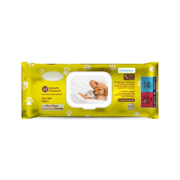 Le salviettine WIPETS create per l’igiene quotidiana dei tuoi amici animali. Sono umidificate con una soluzione senza alcool che deterge, deodora e lucida il manto del tuo animale