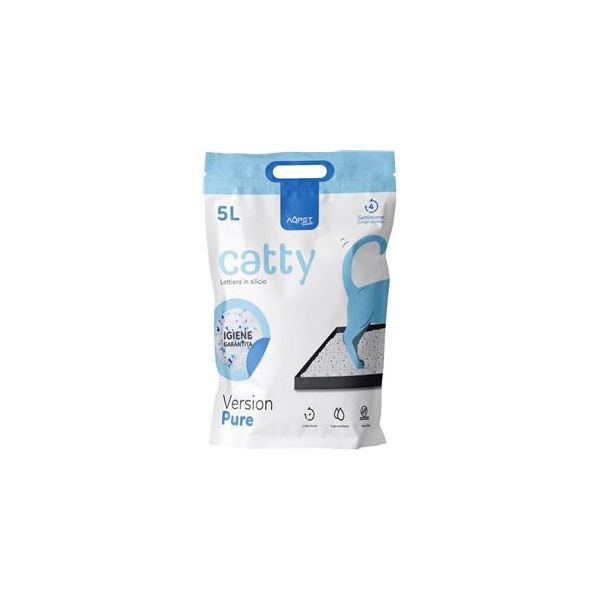 La lettiera CATTY PURE, composta da gel di silice, è un prodotto antibatterico, anallergico, naturale, anti-odore e ultra-assorbente. Grazie alla sua naturale struttura chimica, caratterizzata da una spiccata micro-capillarità dei granuli, assorbe i liquidi con i quali entra in contatto. Riesce così a trattenere l'urina e i cattivi odori, evitando la proliferazione dei batteri patogeni negli ambienti circostanti. Grazie all'elevata purezza del materiale ed al basso tenore di polveri, la lettiera CATTY garantisce una durata maggiore di assorbimento rispetto alla media.