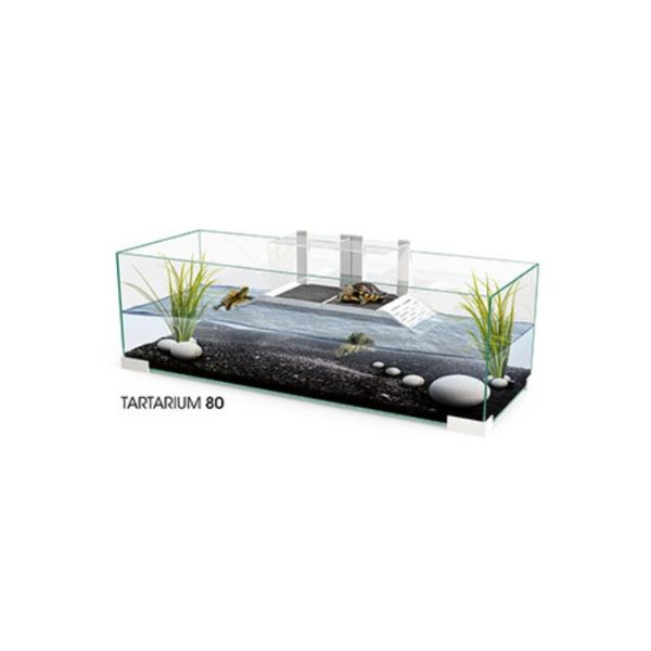 Con materiali di alta qualità il tartarium è costituito da vetro, che consente una visione completa di tutti i movimenti delle tartarughe e plastica bianca con finitura lucida sui suoi quattro supporti e rampa.