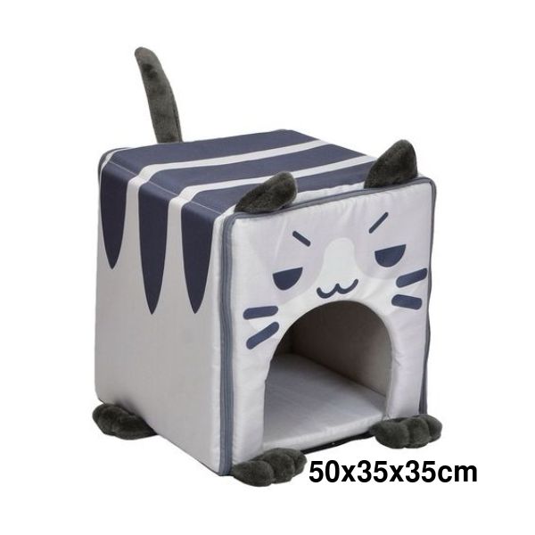 Con questo divertente letto per gatti, il tuo gatto sarà al centro dell'attenzione! Questo letto per gatti è progettato a forma di casa con l'aspetto di un gatto. Il cottage ha un ingresso sul davanti ed è dotato di zampe, orecchie e coda "vere". La divertente stampa con la faccia del gatto e le strisce lo rende completo! Il letto è dotato di un comodo cuscino in modo che il tuo gatto possa riposare per molte ore in questa casa. La casa è realizzata in tessuto foderato e quindi mantiene bene la sua forma.