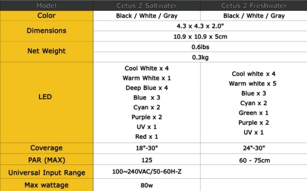 Questo rende uniforme la copertura della distribuzione nell'acquario. La plafoniera Cetus 2 ha un aspetto gradevole e compatto e ben 84W di potenza nella versione per acquari marini. L'ottica di alta qualità ed il design semplice ne garantisce l'ottima intensità e penetrazione.