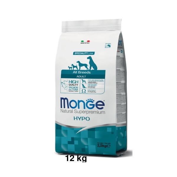 Monge Natural Superpremium Hypo con Salmone e Tonno è un alimento completo dietetico per cani adulti, formulato per la riduzione di intolleranze a ingredienti e sostanze nutritive, con una fonte selezionata di carboidrati (riso).