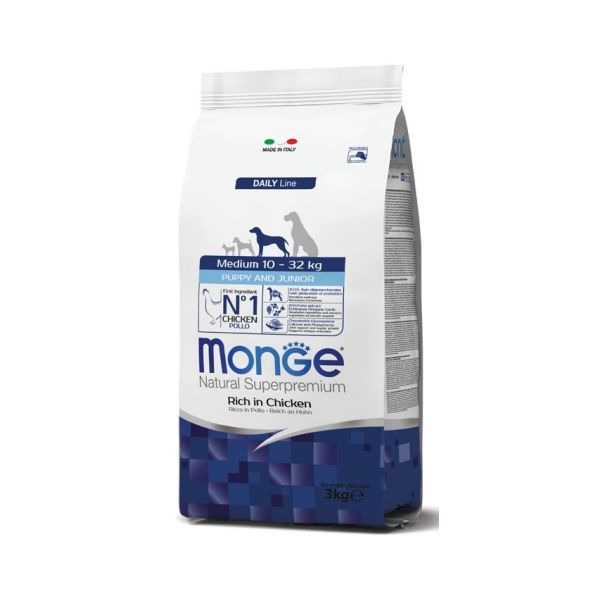 Monge Natural Superpremium Medium Puppy and Junior Ricco in Pollo è un alimento completo per cani cuccioli di taglia media (10-32 kg).