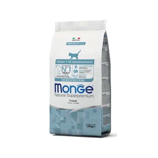 Monge Natural Superpremium Monoprotein* Kitten Trota è un alimento completo e bilanciato per gattini. Specificatamente sviluppato per il benessere del tuo gattino grazie alla presenza di un bilanciato apporto di calcio e fosforo per il supporto dell’accrescimento.