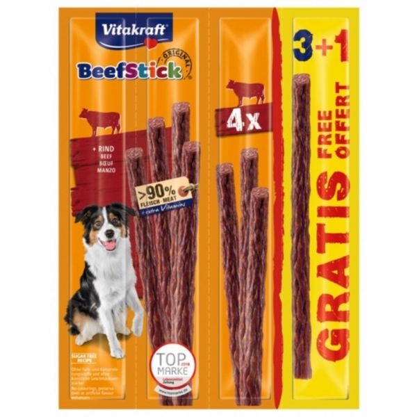 Beef Stick è un gustoso snack per cani alla carne, uno sfizioso fuoripasto a forma di stick, fatto con più del 90% di pura carne della migliore qualità arricchita di sostanze minerali e Vitamina E.